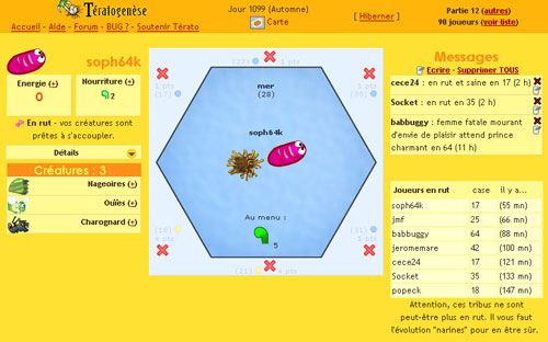 Tout au dessus au milieu, il y a une icône "carte", ça sert à voir où se trouve la case sur laquelle je suis, ainsi que les cases des autres joueurs, donc si je vois que telle ou telle bestiole est en rut en case 47, par exemple, je regarde sur le plan quel est le chemin le plus court pour aller là-bas (en passant uniquement par des cases où je sais respirer). A droite on voit les messages que les autres joueurs envoient ainsi que la liste des joueurs en rut et l'endroit où ils se trouvent. Voila, c'est pas compliqué quand même....