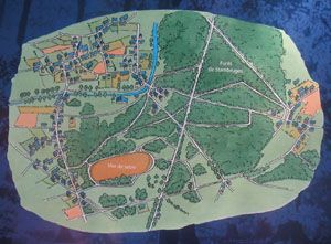 En haut à gauche, le petit village de Stambruges. En vert, la foret de Stambruges et en bas, l'ellipse orange est la Mer de Sable, longue de 600 m.