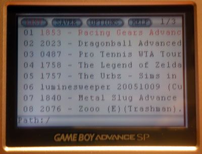 Il faut utiliser un programme qui convertit les roms au bon format et permet d'activer la sauvegarde. Il suffit de copier les roms GBA de son choix via l'explorateur Windows sur la carte Compact Flash et c'est parti. On se retrouve ensuite avec une interface pour lancer les jeux :