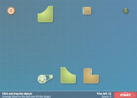 Un petit jeu sympa pour passer le temps de ceux qui s'ennuient au boulot. Il faut déplacer les éléments de l'écran pour que la balle touche la cible.