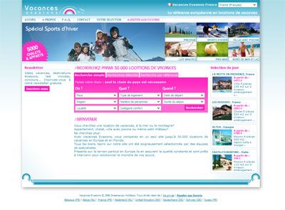 Une fois n'est pas coutume, voilà le dernier projet sur lequel j'ai travaillé au boulot : Vacances Evasions en collaboration avec GOAMS. Il s'agit d'un site de location de villas et résidences de vacances en Europe et en Floride. Je ne suis pas l'auteur de la charte graphique, mais j'ai beaucoup remanié le design du site, xhtml, css & co ;-)