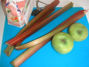 Ce matin, j'ai profité des bâtons de rhubarbe que m'a donné ma mère et des pommes que nous avons achetées hier pour faire d'autres confitures.