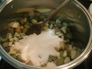 On laisse transpirer les fruits quelques minutes en mélangeant doucement puis on ajoute le sucre. On règle un feu vif et on mélange assez souvent. C'est parti pour une demi heure de cuisson.