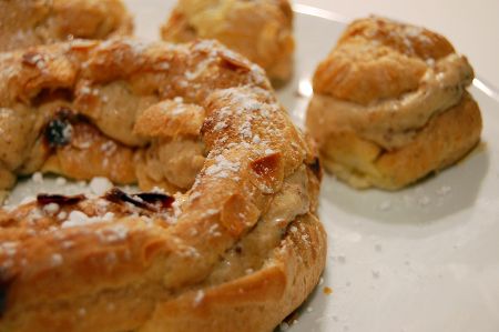Quand les couronnes sont refroidies, les couper en deux et tartiner la partie du bas d'une très épaisse couche de crême. Eventuellement, utiliser une poche à douille. Remettre la partie du haut, décorer de sucre impalpable.