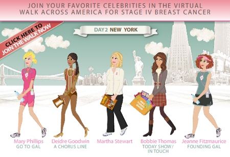 Pour amener les foules, différentes personnalités américaines ont créé leur Gal. La balade d'aujourd'hui est à New York, hier c'était à Boston, demain ce sera ailleurs et ainsi de suite pendant un mois jusque San Francisco. Pour créer votre personnage, il vous en coutera quelques petits 3 $, payables par carte de crédit. La totalité de la somme va à la fondation Gal to Gal. Il est possible également de faire des dons supplémentaires, mais ce n'est évidemment pas obligatoire. Plus de 2000 personnes participent actuellement à la promenade et la somme gagnée approche en ce moment les 24 000 $. L'idée est de rassembler un milion de personnes dans cette promenade virtuelle.