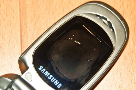 Après séchage, il fonctionnait toujours mais les petites bulles du circuit-imprimé-clavier avaient toues éclaté, donc impossible de composer un numéro ... (bon d'accord, on peu discuter sur le terme "fonctionnait").