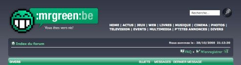 Mr. Green: C'est un forum axé avant tout sur la bonne humeur. On y parle de tout, de rien, mais surtout pas de rien du tout ! Faut pas déconner non plus ! Enfin si en fait… Faut déconner ! Nous abordons avec sérieux et dérision n'importe quel sujet : que ce soit de cinéma, de la télé, des jeux, des buzz sur le net, des news insolites, etc. Un bon jeu de mot ou une bonne vanne ne sera jamais bien loin !