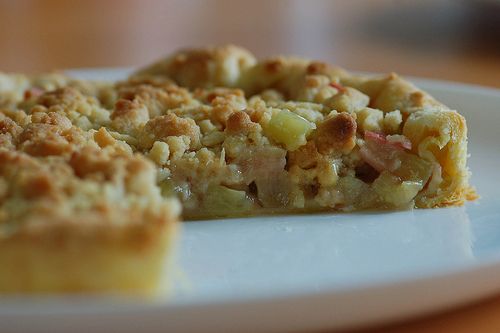 Déposer la rhubarbe dans le fond de tarte, saupoudrer de crumble, et hop 30 à 35 minutes au four.