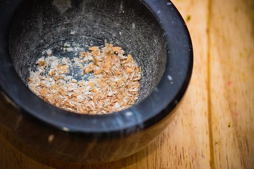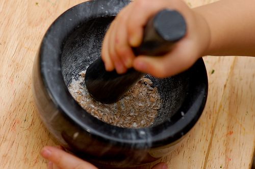 Puis on explique , pour la énième fois, que le blé va servir à faire de la farine, qui servira, elle, à faire du pain, des gâteaux, des biscuits, des pâtes… Et comme c’est abstrait tout ça, on ramasse quelques épis de blé et on se dépêche de rentrer à la maison pour les écraser dans le mortier, les secouer dans la passoire et voir et goûter la farine tout douce qui apparait comme par magie.