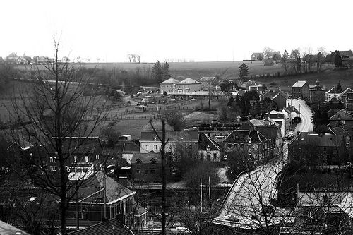 La route de l'école: Nous avions une bonne demi heure de route avant d'arriver à l'école. Il me semble que je passais cette demi-heure à lire. Je crois même me souvenir que je profitais de l'éclairage orange des lampes de rue lorsqu'il faisait encore noir. Néanmoins je levais le nez de mes livres lors de ce tronçon en particulier. Ca commençait en haut à gauche de la photo. Il était possible de prendre un peu de vitesse et descendre toute cette route comme si nous faisons la course. La course se continuait par un saut périlleux, ou presque. J'en avais en tout cas les sensations dans le ventre en passant à toute vitesse sur le pont de la Sambre (en bas à droite de la photo). Après ces émotions fortes, la voiture passait sous le pont de la gare et se transformait en 4X4 pour remonter toute la côte de Lobbes. Cette côte était en pavés, elle était de très mauvaise qualité, des trous partout.