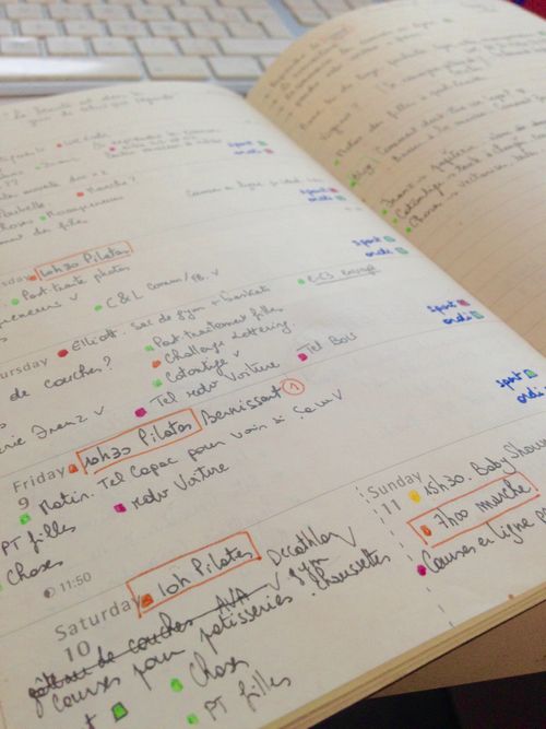 J’ai jamais réussi à retenir le code du check. Quand tu fais ta liste, au lieu de mettre un tiret devant ce qui est à faire, tu mets un point. Quand tu check pour de vrai, parce que « bravo, mission accomplie ! », tu remplaces le point par autre chose (une croix si je me souviens bien), quand tu check pour dire « je le ferai demain » (bouuuh, pas bien, espèce de désorganisée!), tu remplaces le point par autre chose encore (une flèche ?) etc. Un petit code par situation. Je ne dois pas avoir la mémoire des codes. Je dessinais un petit carré que je coloriais quand la mission était accomplie. Puis ma créativité en a pris un coup, j’avais l’air débile avec mes petites bannières devant des instagrameuses qui te font une oeuvre d’art pour chaque semaine. Et puis surtout, c’est chronophage. Sur le temps qu’il me fallait pour faire une belle page de semaine, j’aurais pu checker deux ou trois points. Puis tu passes une partie de ta vie à scroller instagram et pinterest. Et puis il est l’heure d’aller chercher le loustic à l’école et t’as encore rien checké.